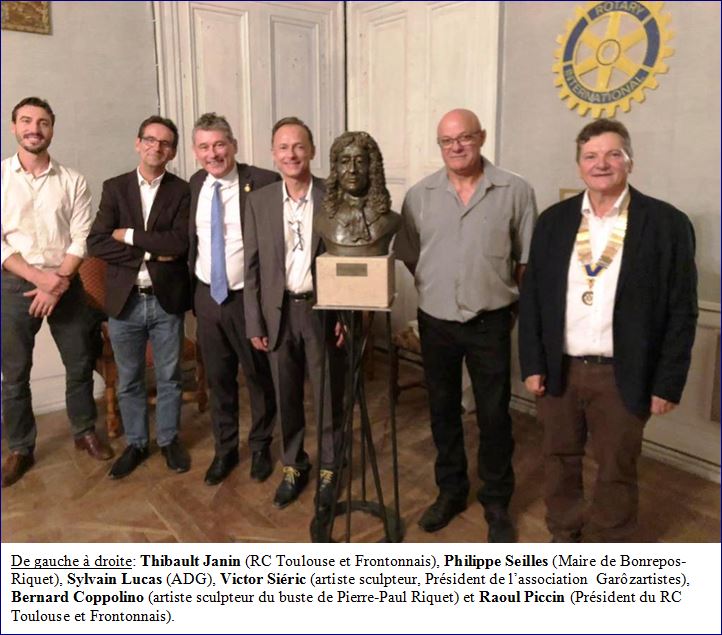 A l’occasion des Journées du Patrimoine, un buste en grès patiné bronze a été installé dans le Grand Vestibule du château. Il rappellera aux visiteurs que le constructeur du canal a travaillé ici. L’œuvre a été dévoilée ce jeudi 19 septembre, en présence du maire Philippe Seilles, du sculpteur Bernard Coppolino de l’atelier "Garôzartistes", de Sylvie Boulay, présidente de l’association Sauvegarde et Valorisation du Domaine de Bonrepos-Riquet, Victor Siéric, Président de l'association "Garôzartistes" et de Raoul Piccin, président du Rotary Toulouse et Frontonnais.